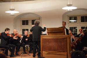 Im Mittelpunkt dieses Weihnachtskonzertes stand Händels d-Moll-Orgelkonzert Nr. 10. „Sie sind ein wunderbares Publikum, für das wir gerne jedes Jahr hier musizieren und uns Neues ausdenken“, wandte Hartmann sich an die Zuhörer. Mit einiger Muskelkraft haben die Musiker dieses Mal eine Truhenorgel in den Schwörsaal transportiert. Das seltene Instrument ist in der Wangener St.-Martinskirche beheimatet, wo Georg Enderwitz seit 2001 Kirchenmusiker ist. Ein lyrisch gefärbter Orgelauftakt leitet das viersätzige Werk ein, wonach mit dem Allegro cosi cosi ein wechselseitiges Zusammenspiel zwischen Streichern und Tasteninstrument beginnt. Händel habe seine Orgelkonzerte in der Regel während der Pausen großer Oratorien-Aufführungen auf einem eigens für ihn gebauten Orgelpositiv gespielt, ist im Programmheft nachzulesen. Eben diese vergleichsweise intime, kammermusikalische Atmosphäre galt es den Interpreten zum Ausdruck zu bringen. Insbesondere mit dem nachfolgenden Organo ad libitum im Stil einer Fuga, deren zeitlich versetzte Orgelstimmen sich zu einer Einheit fügten.